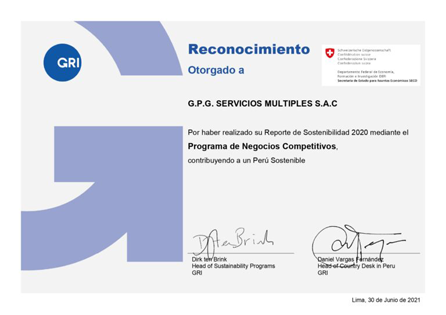 Reconocimiento otorgado por realizar el reporte de Sostenibilidad 2020 mediante el Programa de Negocios Competitivos.