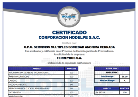 Contamos con la certificación de CORPORACION HODELPE S.A.C. empresa peruana de homologación de proveedores, evaluación de perfiles empresariales de organizaciones, que brinda la confianza y garantiza la capacidad de abastecimiento necesario para nuestros clientes